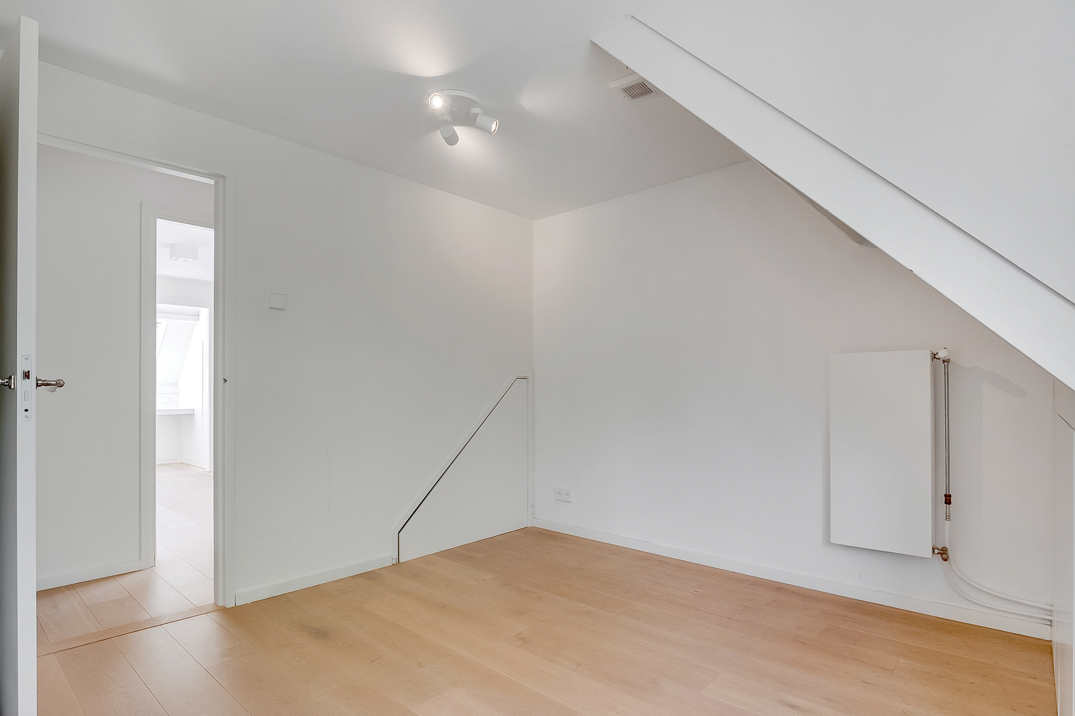 De tweede verdieping biedt een grote voorzolder met veel kastruimte en een zolderkamer met toilet en wastafel.