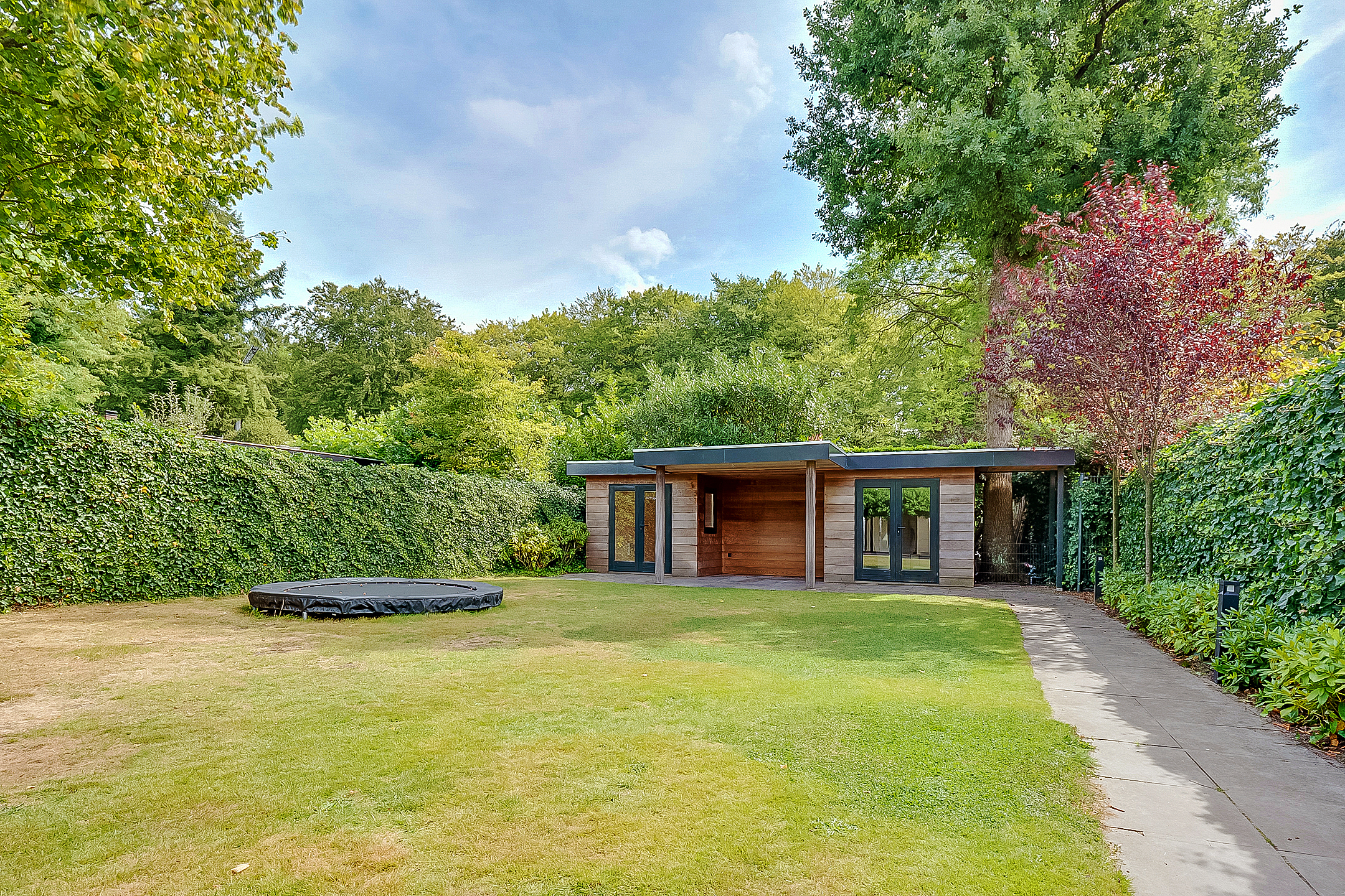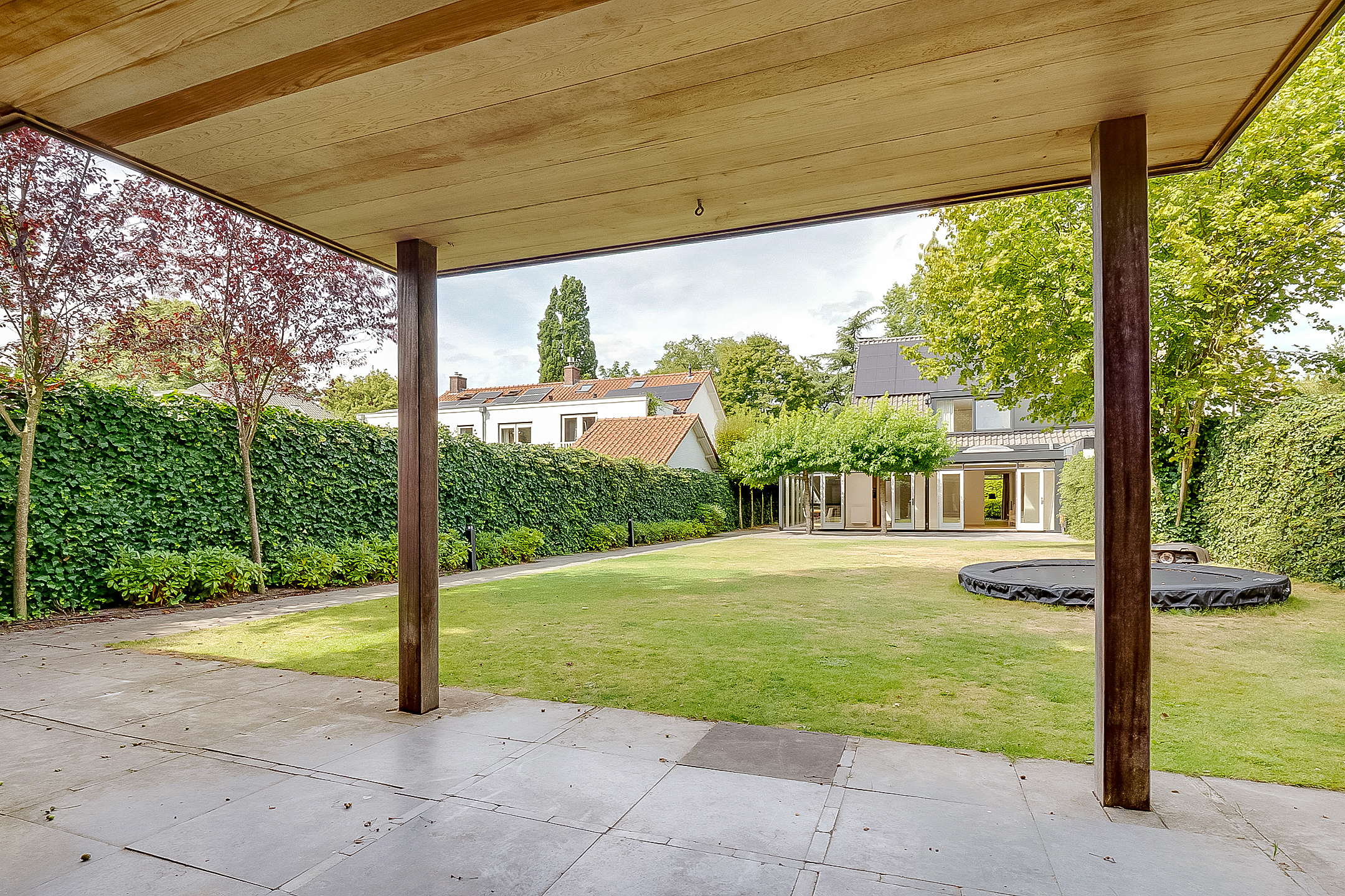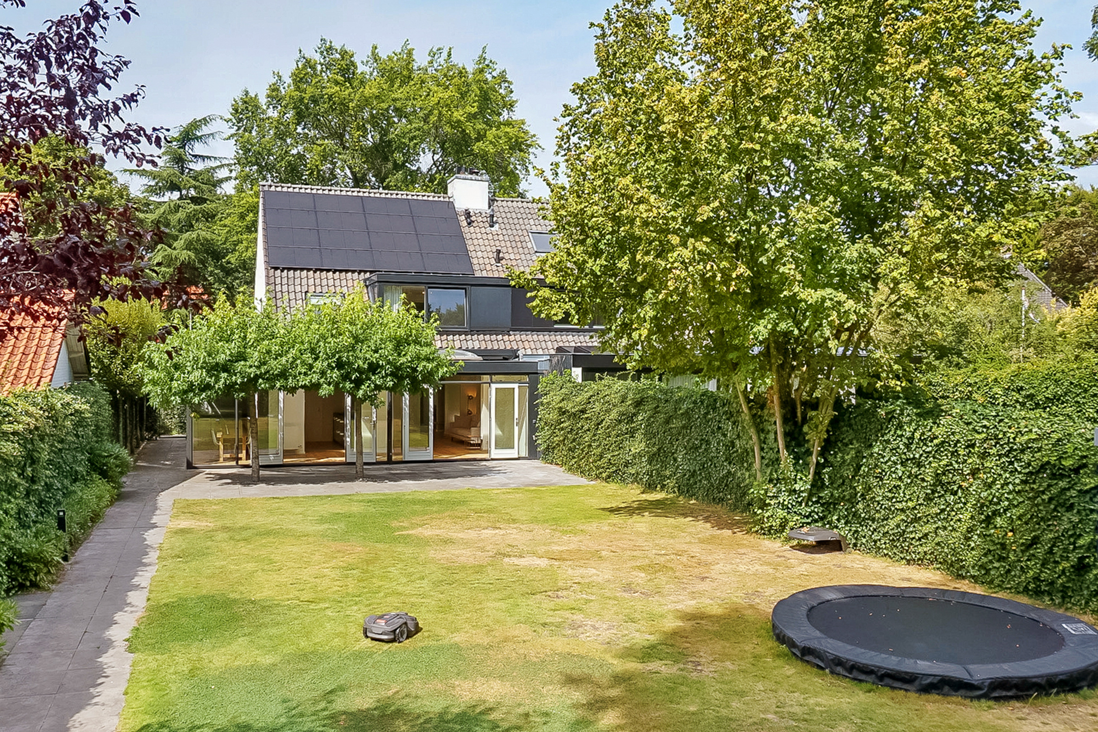 De tuin van deze woning is een absolute blikvanger. De diepe, 25 meter lange achtertuin is perfect gelegen op het zuidoosten en biedt een groot terras, een speelgazon en veel ruimte voor je eigen groene paradijs. Aan het einde van de tuin vind je een dubbele houten berging met een veranda, ideaal voor het opslaan van tuinaccessoires of als extra buitenruimte. De tuin is bovendien voorzien van een eigen beregeningsinstallatie, gevoed door een eigen bron en een robotmaaier, wat zorgt voor een onderhoudsvriendelijke en groene omgeving.