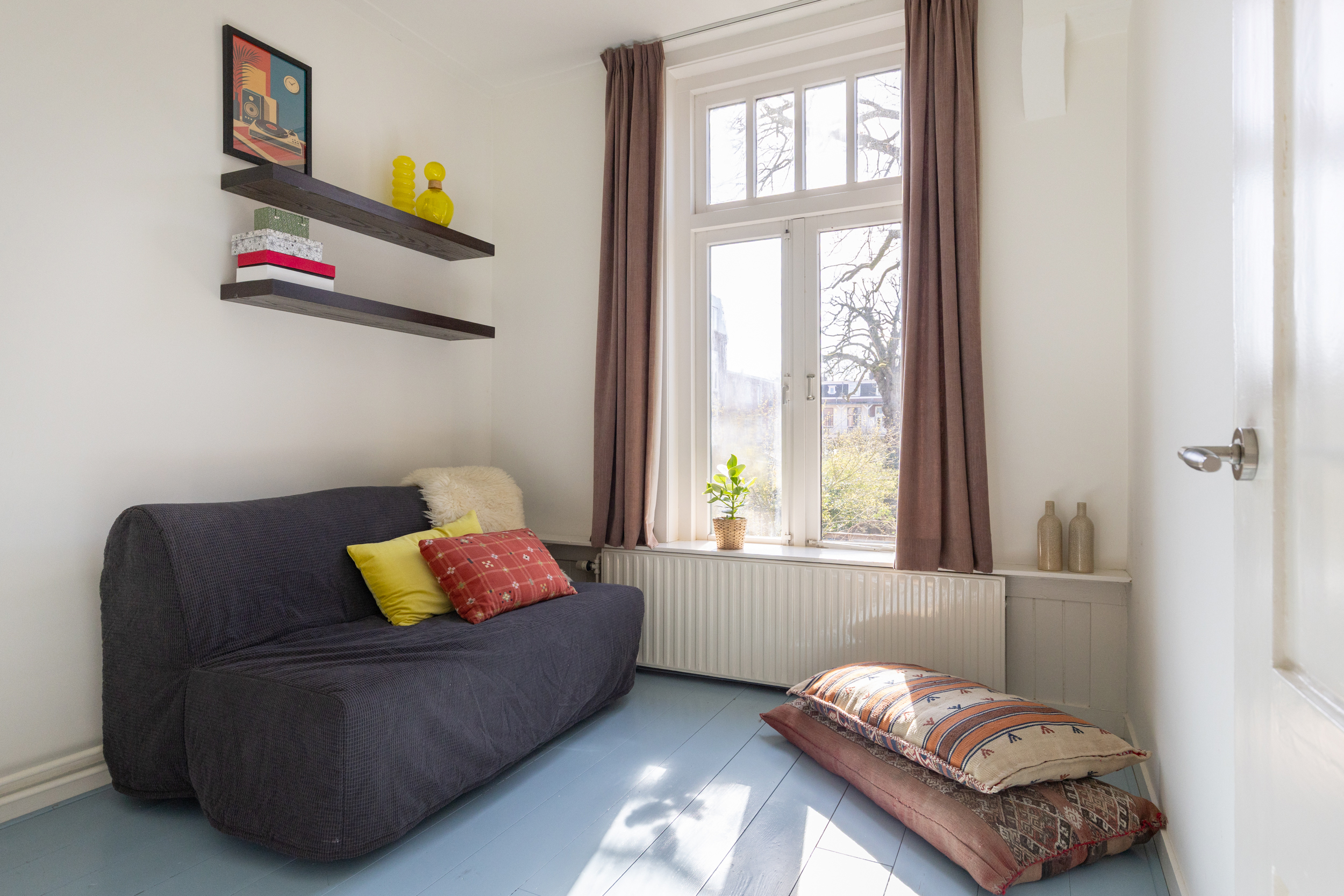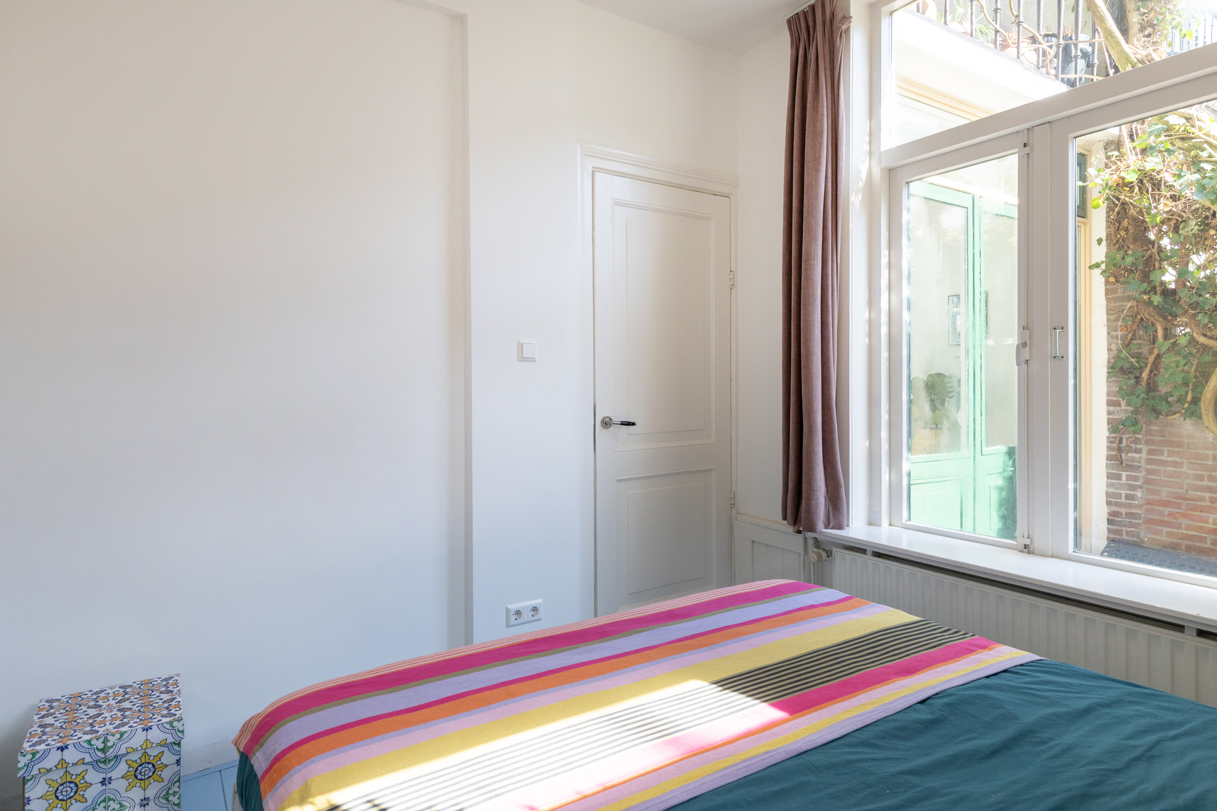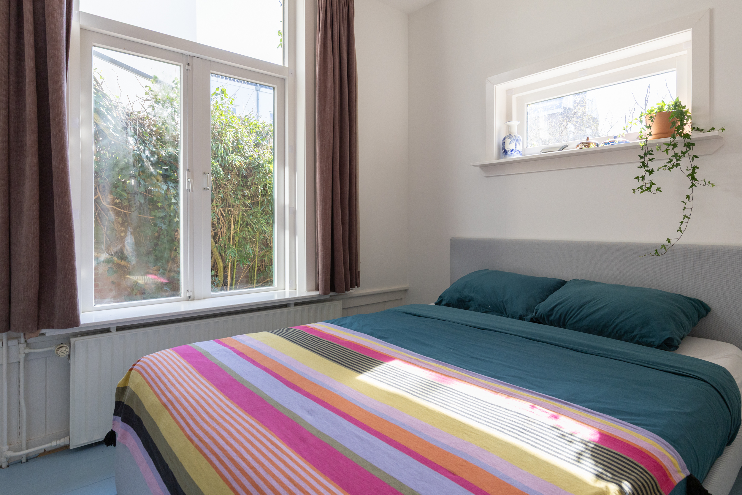 In de speelse slaaptoren die via een trap bereikbaar is, bevindt zich de tweede slaap- of werkkamer. De lichte kamer biedt uitzicht op de binnentuinen en is – net als de slaapkamer beneden – heerlijk rustig door de situering aan de achterzijde waardoor geluiden van de straat steeds ver weg zijn.