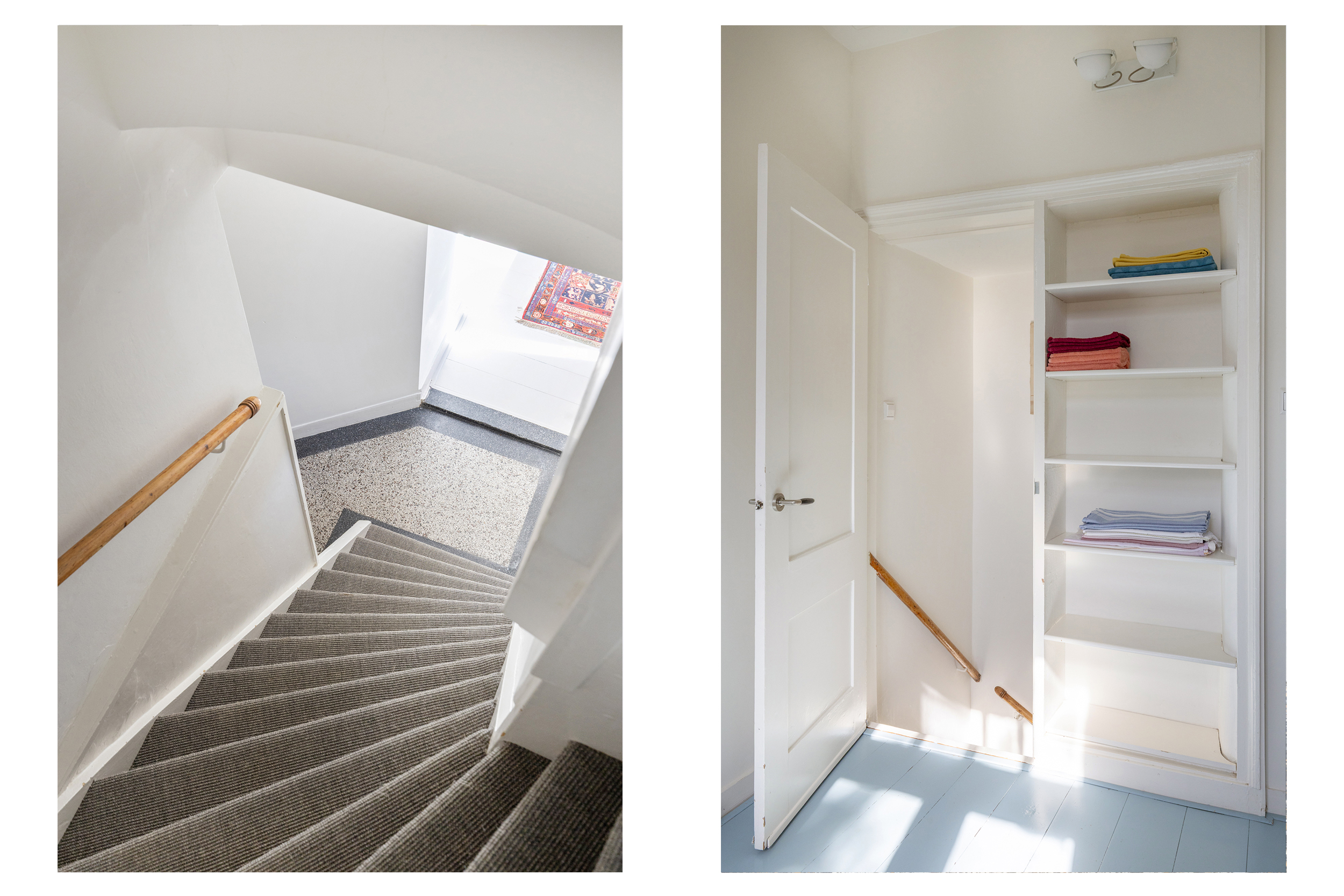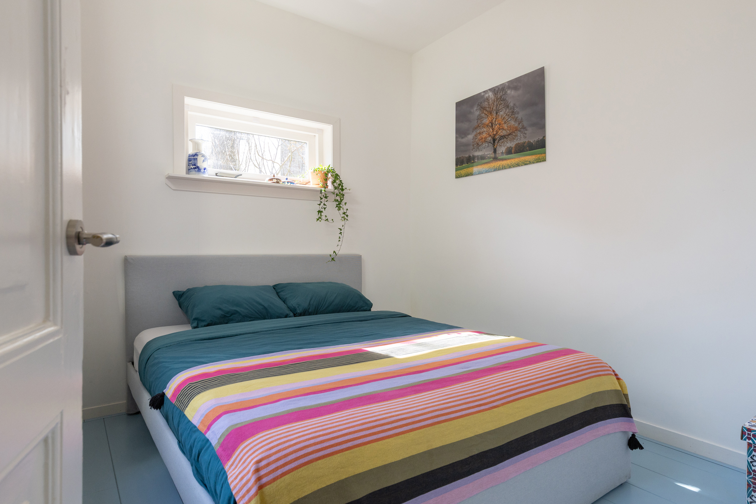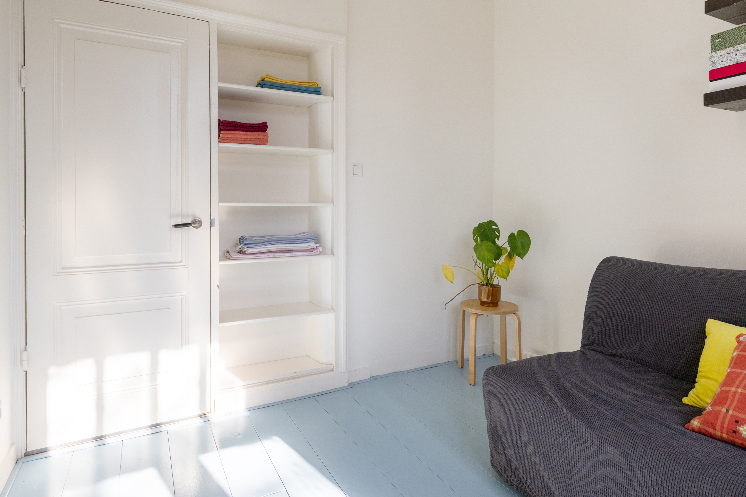 In de speelse slaaptoren die via een trap bereikbaar is, bevindt zich de tweede slaap- of werkkamer. De lichte kamer biedt uitzicht op de binnentuinen en is – net als de slaapkamer beneden – heerlijk rustig door de situering aan de achterzijde waardoor geluiden van de straat steeds ver weg zijn.