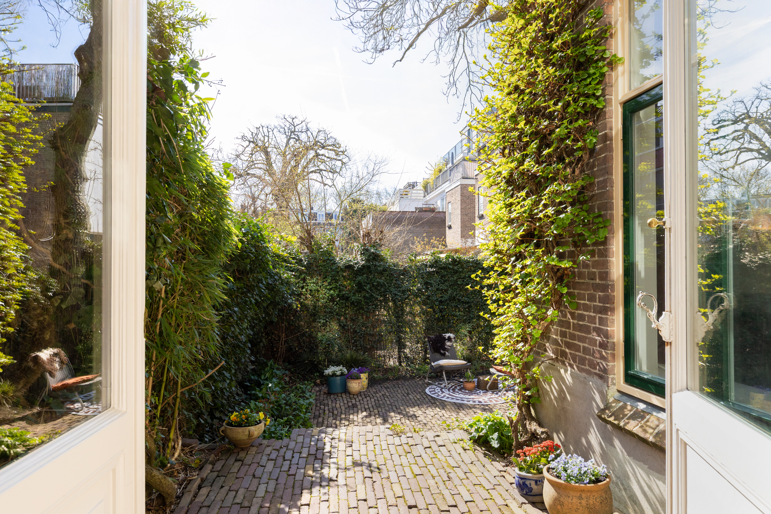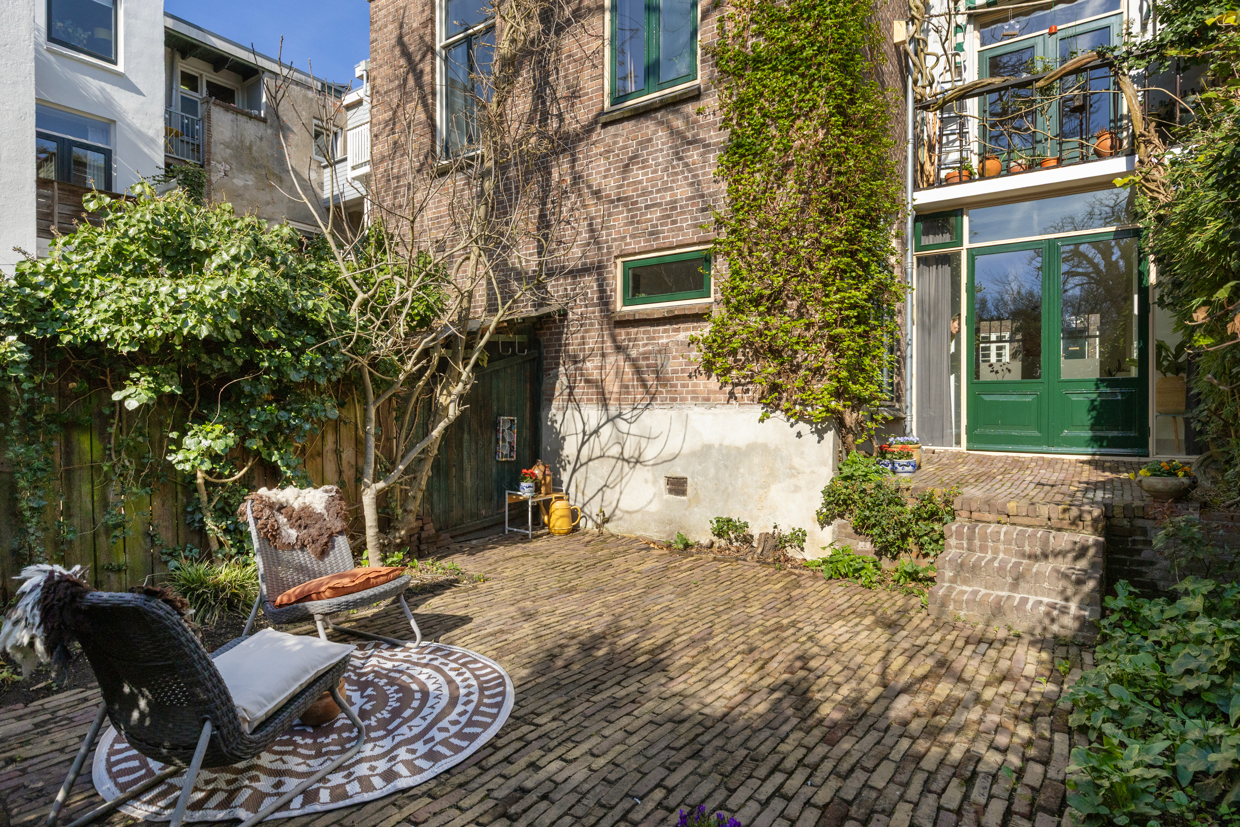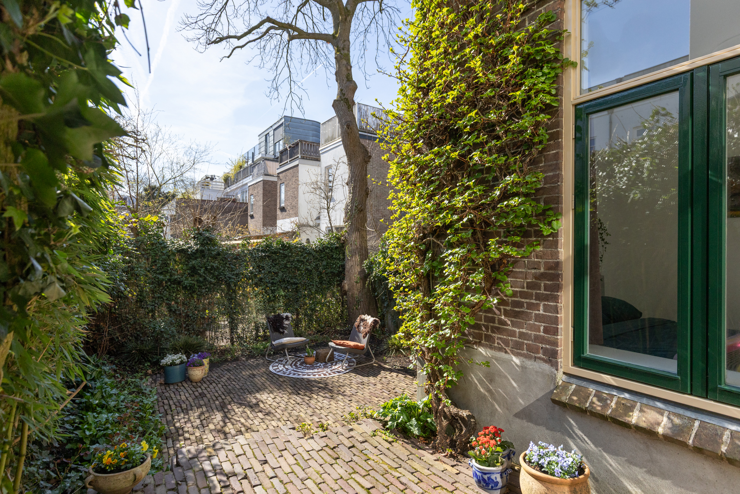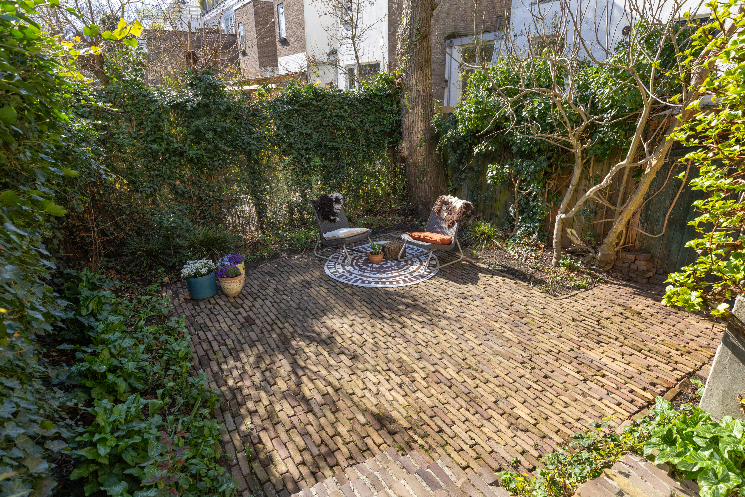 De ruime, verdiepte stadstuin op het zuidwesten is een absoluut pluspunt: zonnig, intiem en onderhoudsvriendelijk. De imposante tamme kastanje biedt beschutting op zomerse dagen. Een heerlijke verlenging van je woonruimte.