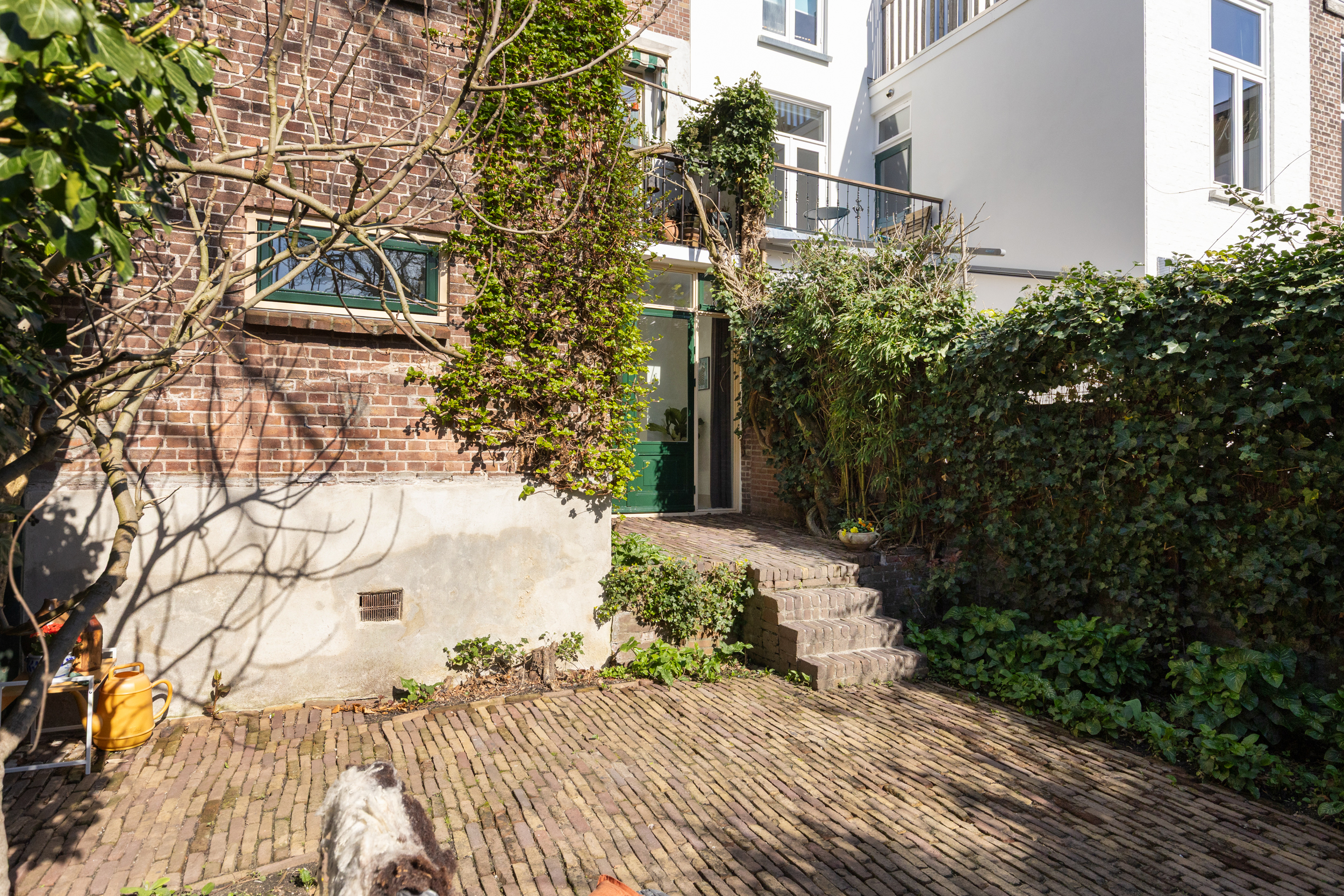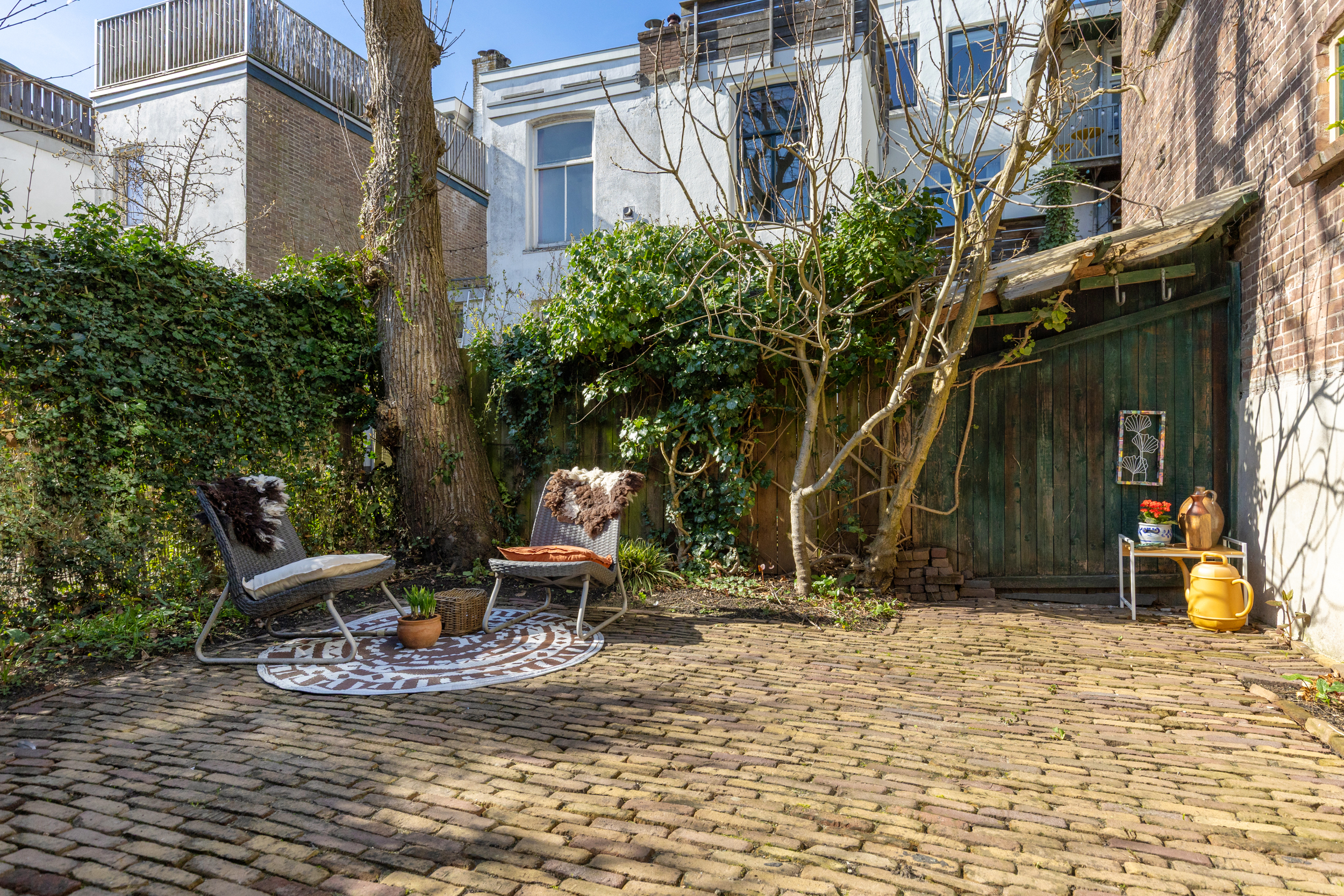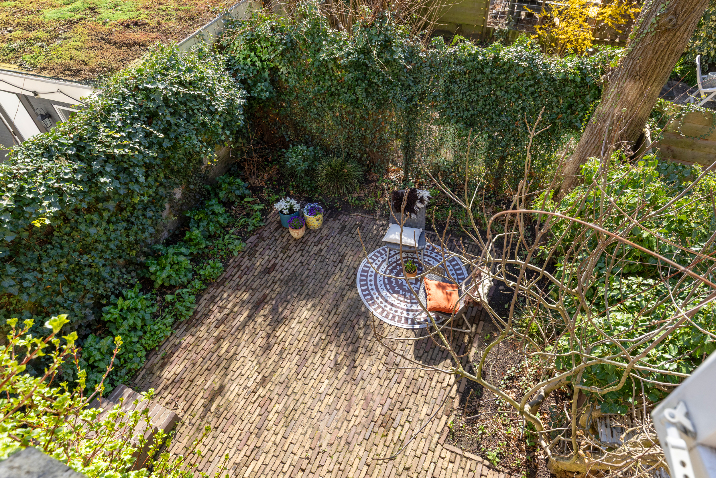 De ruime, verdiepte stadstuin op het zuidwesten is een absoluut pluspunt: zonnig, intiem en onderhoudsvriendelijk. De imposante tamme kastanje biedt beschutting op zomerse dagen. Een heerlijke verlenging van je woonruimte.