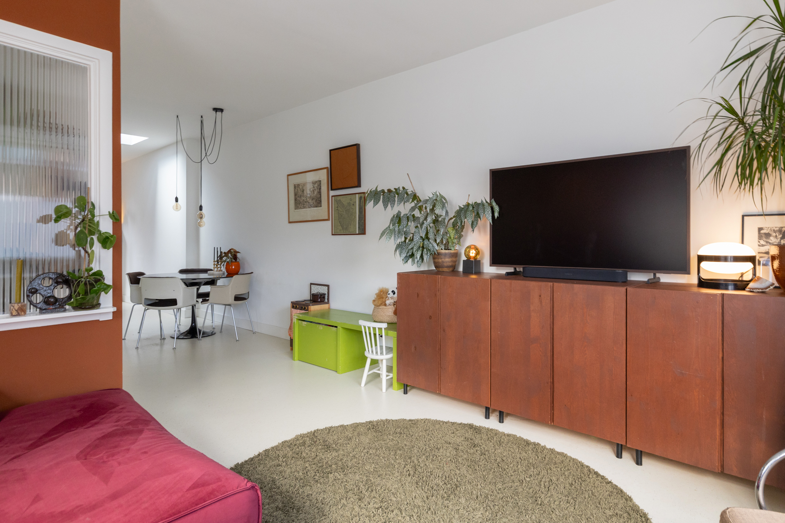 De sfeervolle woonkamer is voorzien van een karakteristieke erker en openslaande deuren naar de knusse tuin op het zuidwesten. De begane grond is uitgerust met vloerverwarming als hoofdverwarming, wat zorgt voor optimaal comfort en een aangenaam binnenklimaat.