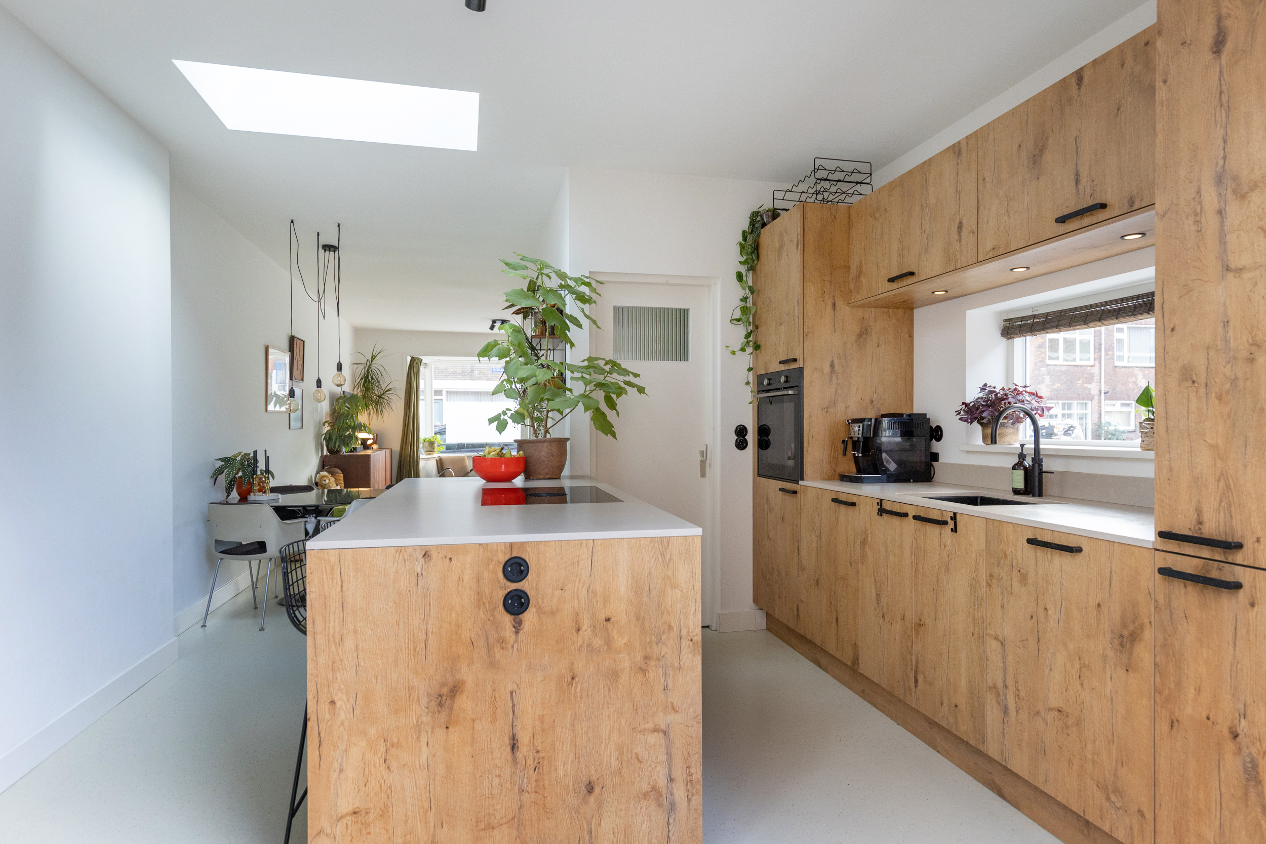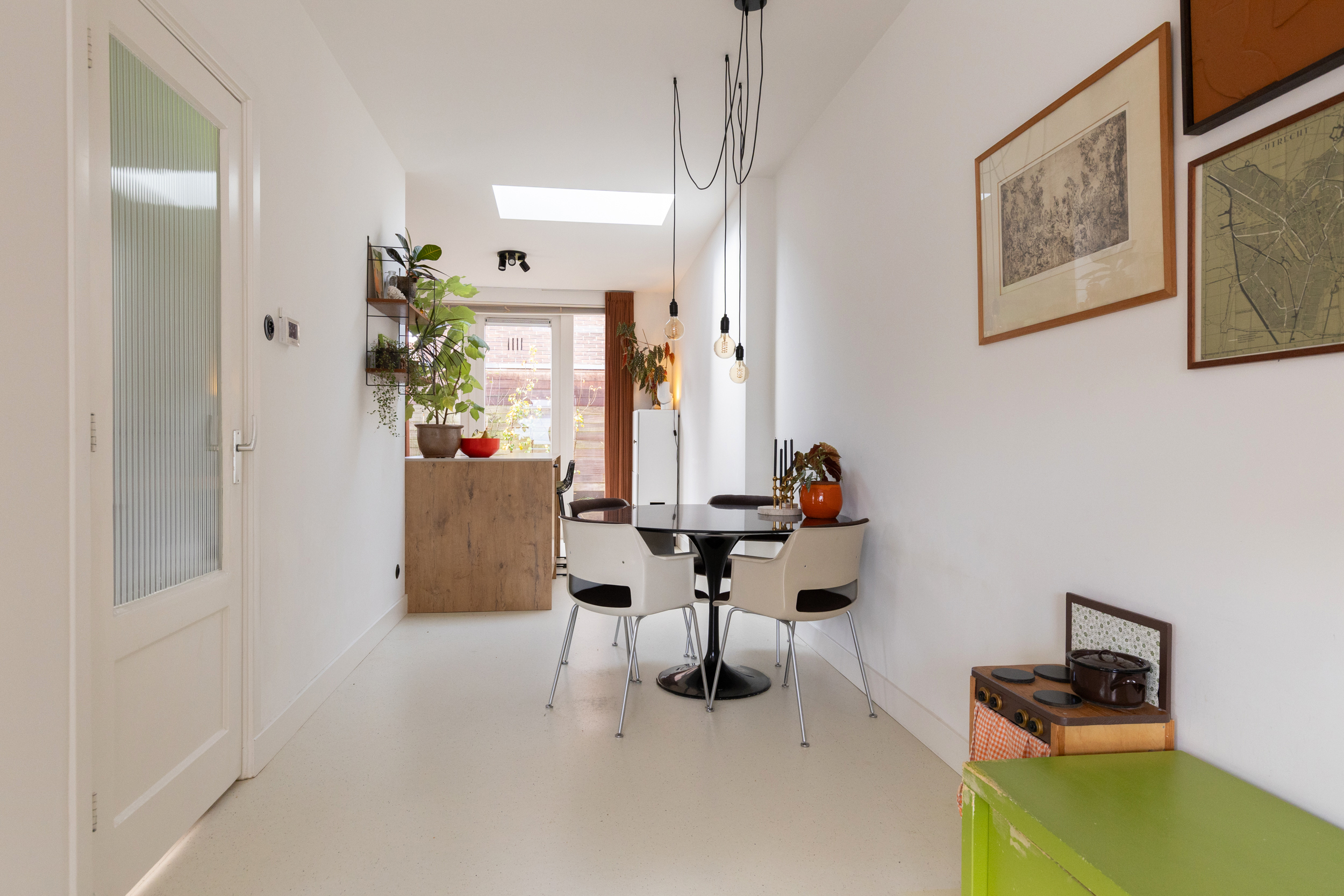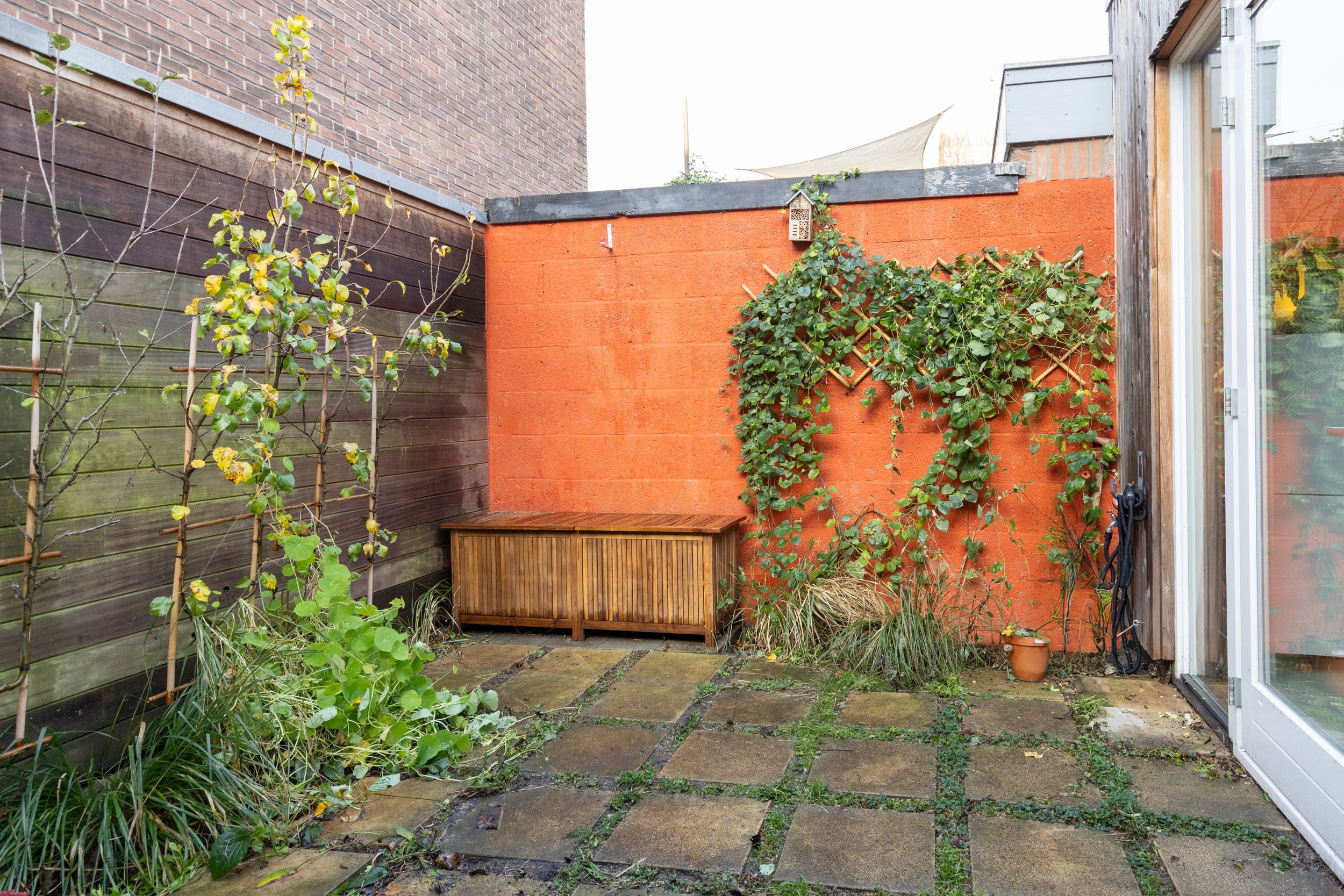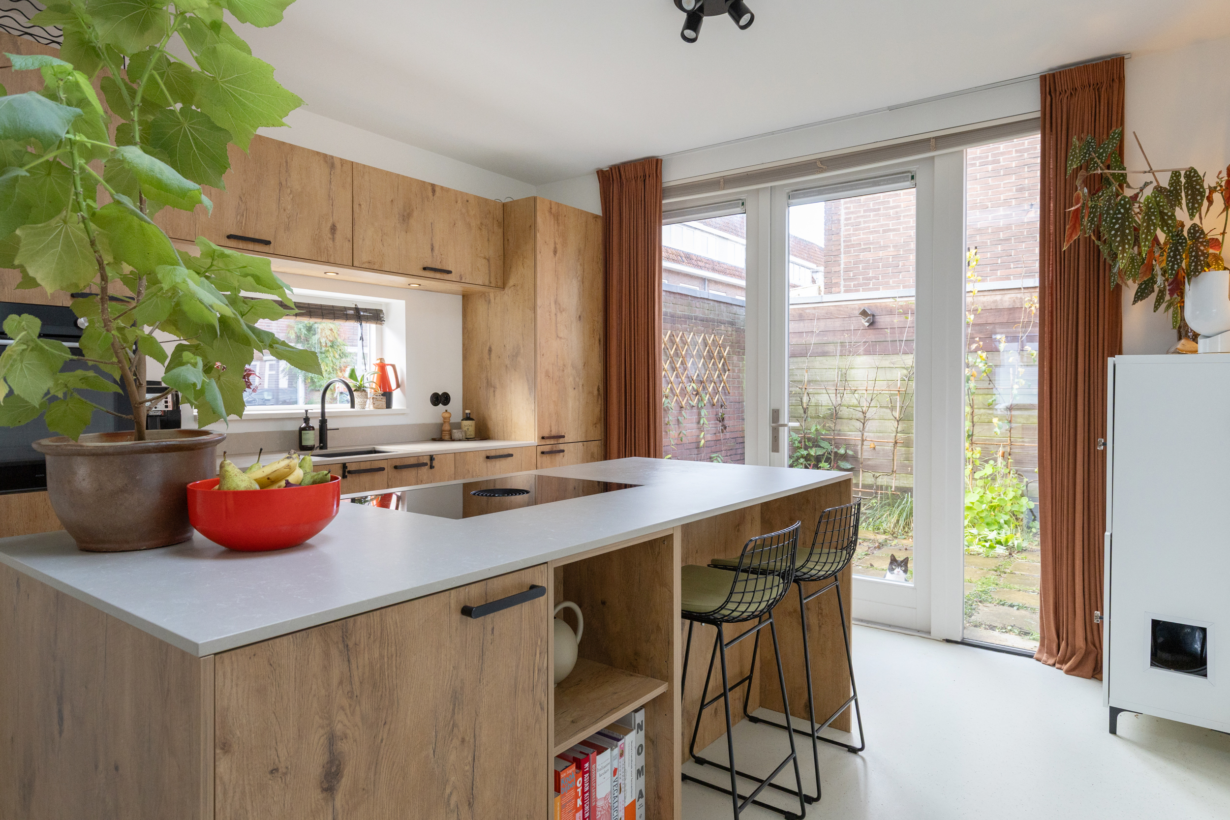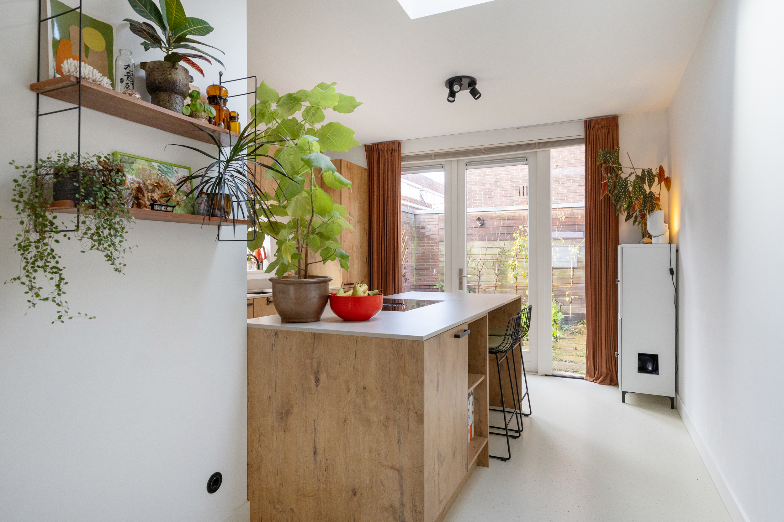 De moderne keuken (2022) is uitgerust met diverse inbouwapparatuur en biedt eveneens toegang tot de tuin. Ook vanuit de straat is er toegang tot de tuin. Op de eerste verdieping zijn twee slaapkamers en een badkamer aanwezig; op de tweede verdieping bevindt zich een extra kamer met dakkapel en veel lichtinval.